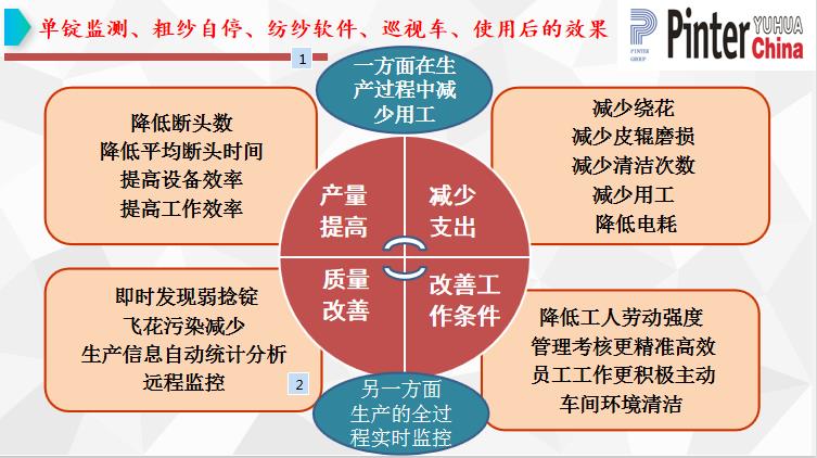 工作環境和勞動強度的改變:使工作變的輕松,提高工人積極性,改變招工難的現狀。飛花減少,一方面有利于紗線質量,另一個方面減少污染,環境得以改善,飛花減少,減少清潔次數,增加車間的潔凈度。減少擋車工及保全工,降低用工成本。