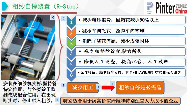 降低用工成本:監測到斷頭可即時打斷粗紗,停止喂入,減少粗紗浪費。由于即時停止粗紗喂入,減少回花,廢棉明顯降低。降低膠輥、皮圈和羅拉的維護:粗紗自停裝置及時停止粗紗喂入,避免了纏繞,降低對膠輥、皮圈、羅拉的損害。減少擋車工及保全工,降低用工成本。